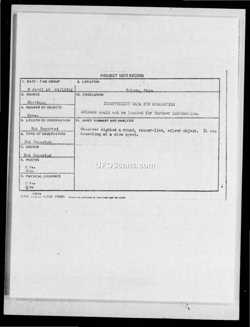 Project 10073 Record: Incident, Toledo, Ohio, 9 April 1949