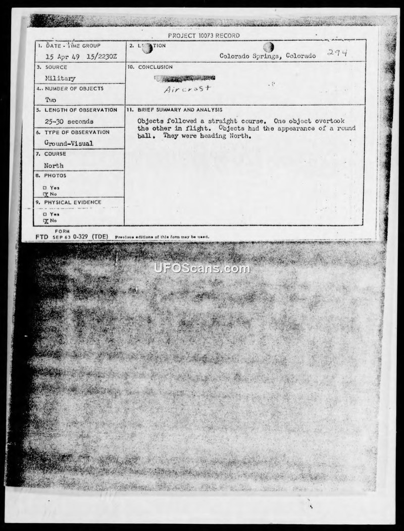 Incident #294 Sighting Report — Peterson Air Field, Colorado, 15 April 1949