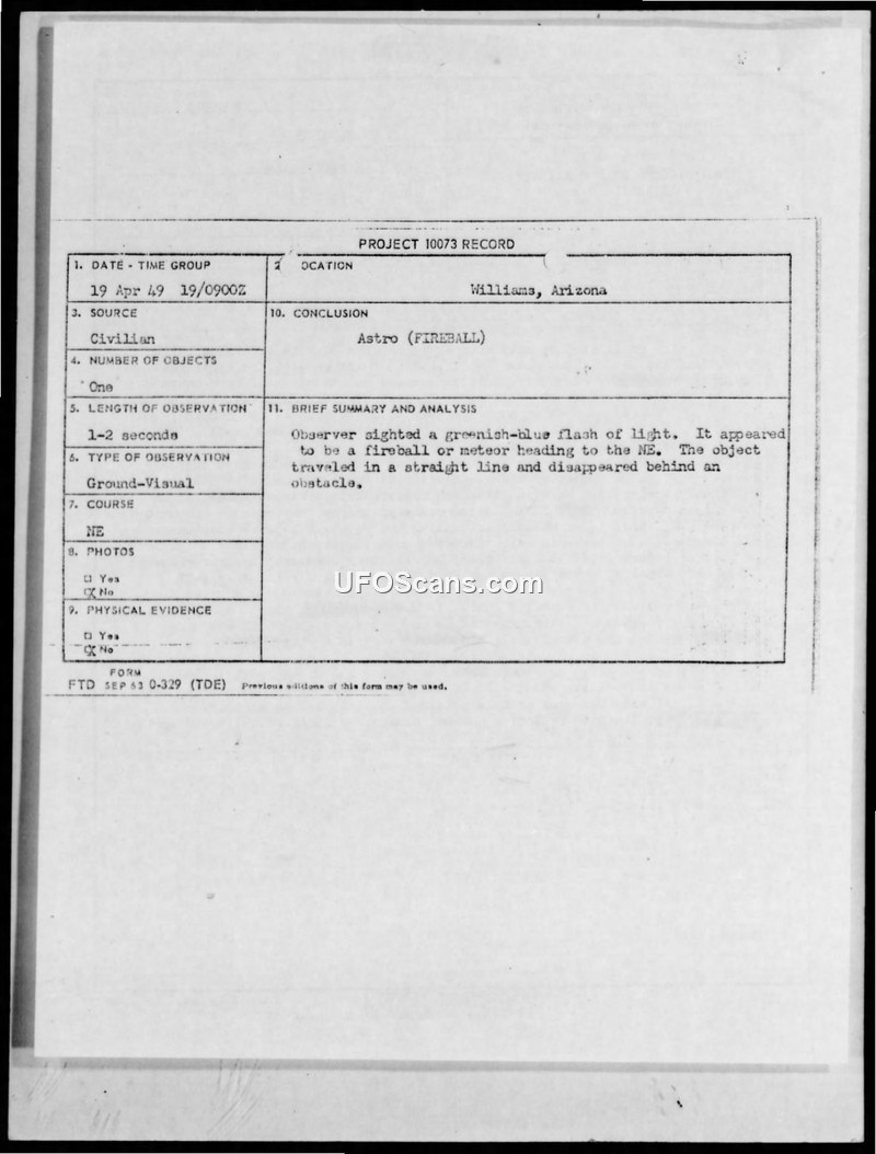 This report documents the investigation into a large fireball sighting near Flagstaff, Arizona, on 18 April 1949. OSI investigators concluded the phenomenon was a meteorite after interviewing multiple witnesses and reviewing weather data.