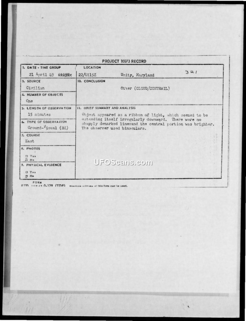 A witness in Maryland reported a 'ribbon of light' in the sky in April 1949. The Air Force officially concluded the sighting was a cloud or contrail.
