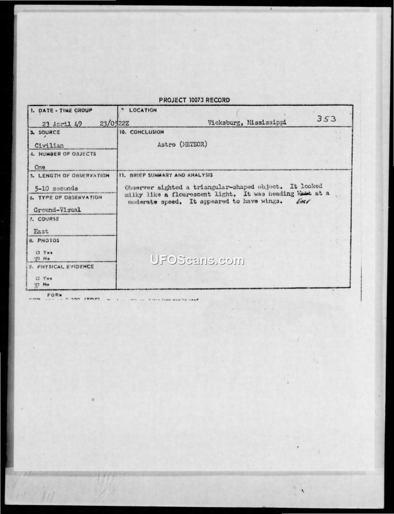 This archive contains a collection of documents related to Incident #353, a sighting of a triangular-shaped object over Vicksburg, Mississippi, on 23 April 1949. The primary report, filed under Project 10073, describes a civilian observation of a triangular object that appeared to have wings and a row of lights along its edges. The object was observed for 5-10 seconds, moving at a moderate speed toward the East. Despite the witness's detailed description, the official conclusion recorded on the project sheet is 'Astro (METEOR).' The archive also includes extensive documentation regarding a separate, high-profile series of reports from White Sands Proving Ground in August 1949, where press coverage of 'flying saucers' or 'flying discs' caused significant concern for military authorities. These documents detail the efforts of the Office of Special Investigations (OSI) to determine the source of these reports, which were linked to press conferences held during the firing of the 'Viking' rocket. Military officials, including General Blackmore and Captain Detchemendy, denied that any official releases regarding 'flying discs' were made by the Army, attributing the stories to press speculation and misinterpretations of technical activities. The documents highlight the tension between military classification, public interest, and the role of the press in disseminating information about unidentified aerial phenomena during the late 1940s. The file includes routing sheets, internal memos, and statements from various personnel, reflecting the administrative process of investigating these reports under projects such as Project Grudge and Project Sign.