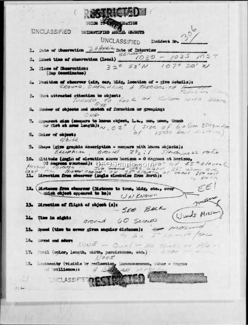 This document details a sighting of an unidentified aerial object on 24 April 1949, near Arrey, New Mexico, by four Navy enlisted men from the White Sands Proving Ground. The observers were conducting a pibal wind run using a standard ML-47 theodolite when they spotted a whitish, ellipsoid object. They initially believed it to be the weather balloon they had just released, but upon checking the theodolite, they realized the balloon was in a different position. The object was described as having a 2 1/2:1 slenderness ratio, appearing white with a light yellow tint on one side, and moving at a high angular speed of 5° per second. The observers estimated the object's altitude at 300,000 feet, assuming it was traveling at escape velocity. The report includes detailed correspondence between the Base Directorate for Geophysical Research and the 3160 Electronics Station regarding the incident. USAF consulting specialists analyzed the data and concluded that the object was almost certainly misidentified. They noted that the observers had no reliable way to determine distance, as they lacked a known reference point, and that the object was likely a small, mundane item at a much closer range than the observers believed. The document also contains technical discussions regarding the use of weather balloons, noting that they do not carry lights or luminescent materials, and provides information on future balloon launch schedules for sites in New Mexico, Oklahoma, Arizona, and Nevada. Major Joseph O. Fletcher, writing for the Commanding Officer, criticized the existing observation questionnaire for being misleading and recommended that future instructions be improved to prevent similar errors in judgment by observers in the field.