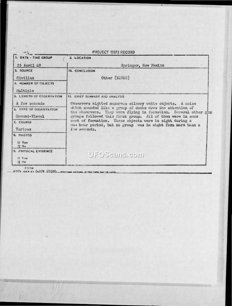 Project 10073 Record: Sighting Incident - Springer, New Mexico, 25 April 1949