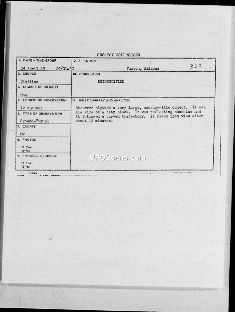 Project 10073 Record — Incident #332, Tucson, Arizona, 28 April 1949