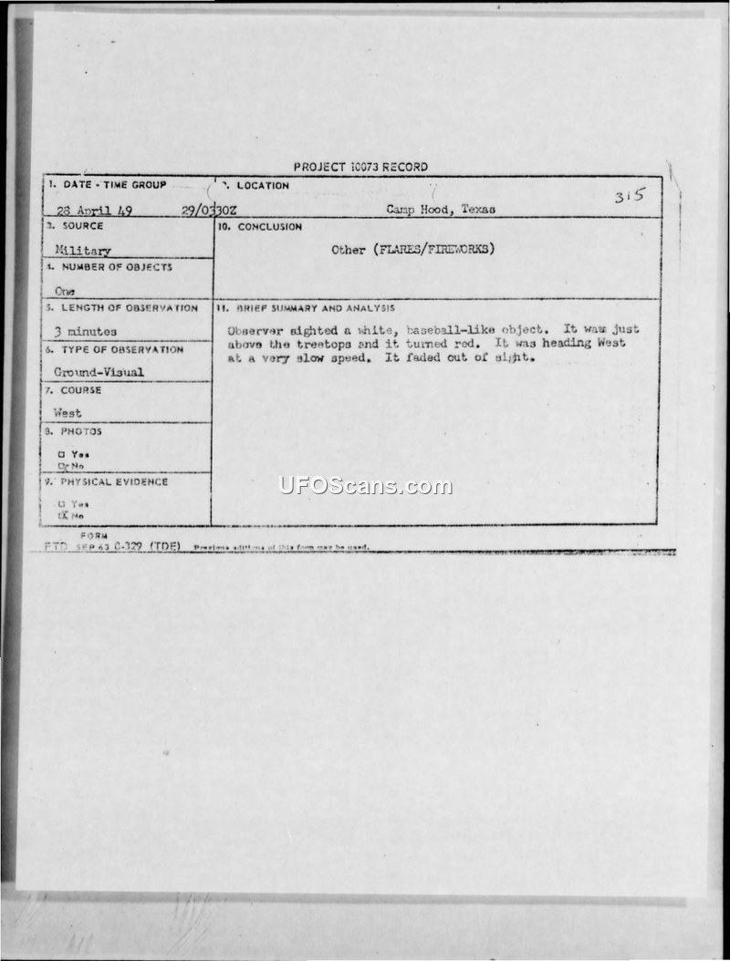 Project 10073 Record: Unidentified Aerial Objects - Camp Hood, Texas, April 1949