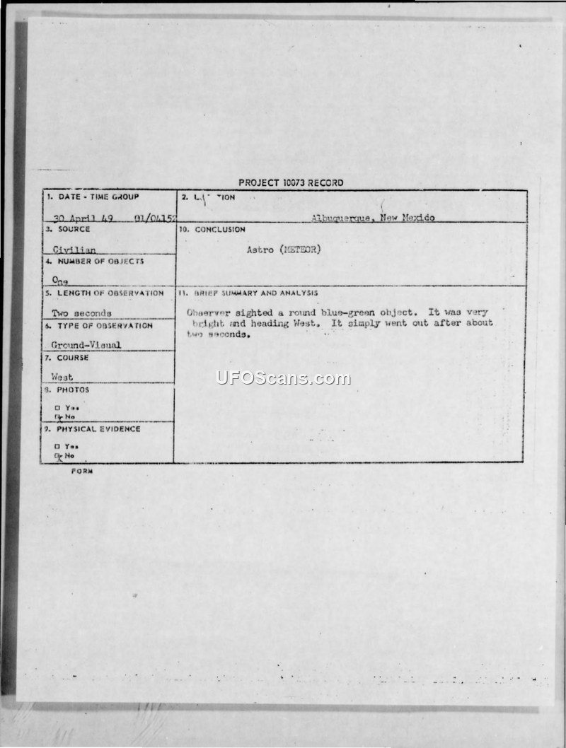 Project 10073 Record: Incident #322, Albuquerque, New Mexico, 30 April 1949