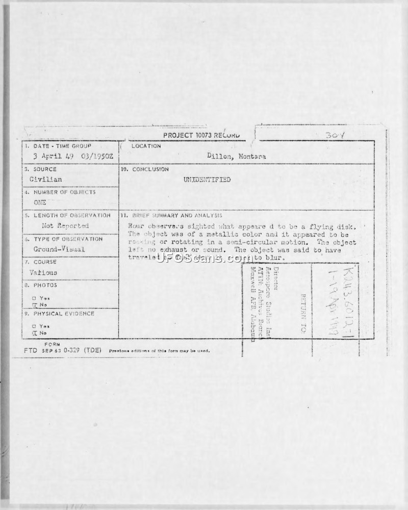 Project 10073 Record — Dillon, Montana, 3 April 1949
