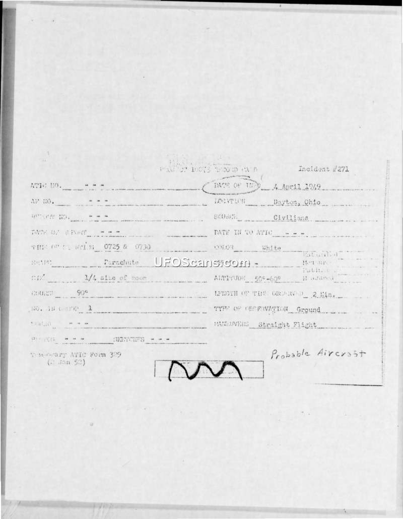 Incident #271 Sighting Report — Dayton, Ohio, 4 April 1949