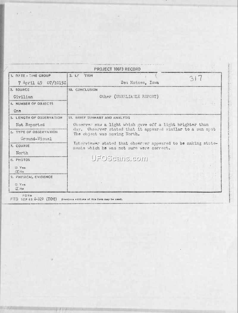 Project Grudge Incident #317 — Des Moines, Iowa, 7 April 1949
