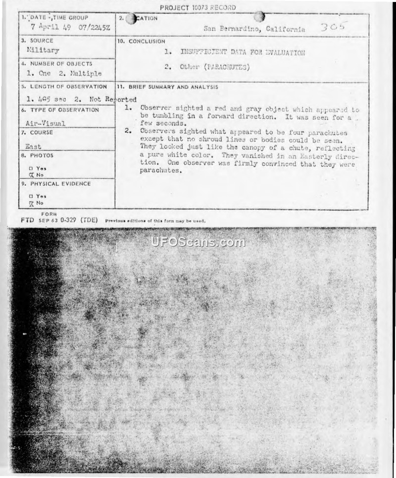 Project 10073 Record — Incident 305, San Bernardino, California, 7 April 1949