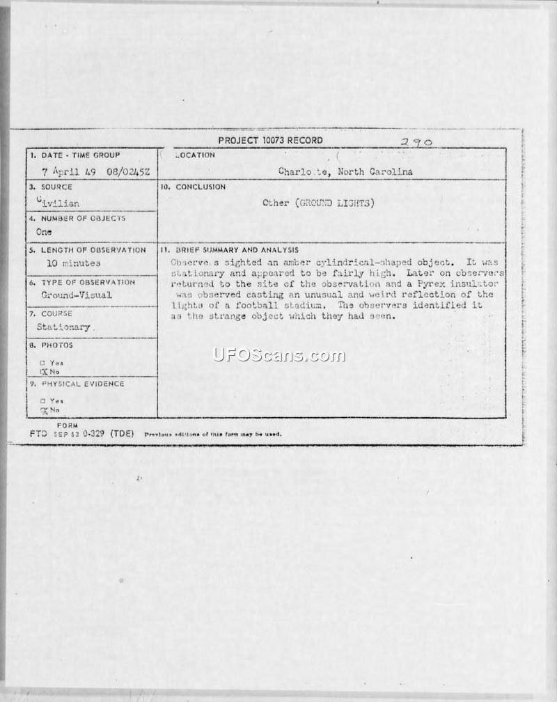 Project 10073 Record 290: Unconventional Aircraft Sighting, Charlotte, North Carolina, 7 April 1949