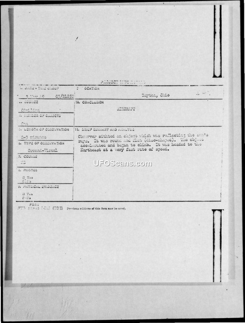 The object was observed by two witnesses in Dayton, Ohio, on May 3, 1949. It was described as a flat, round, disc-shaped object that appeared to be gold or bronze in color. It exhibited a flipping or oscillating motion while climbing and moving at a high rate of speed. The investigator concluded the object was an aircraft.