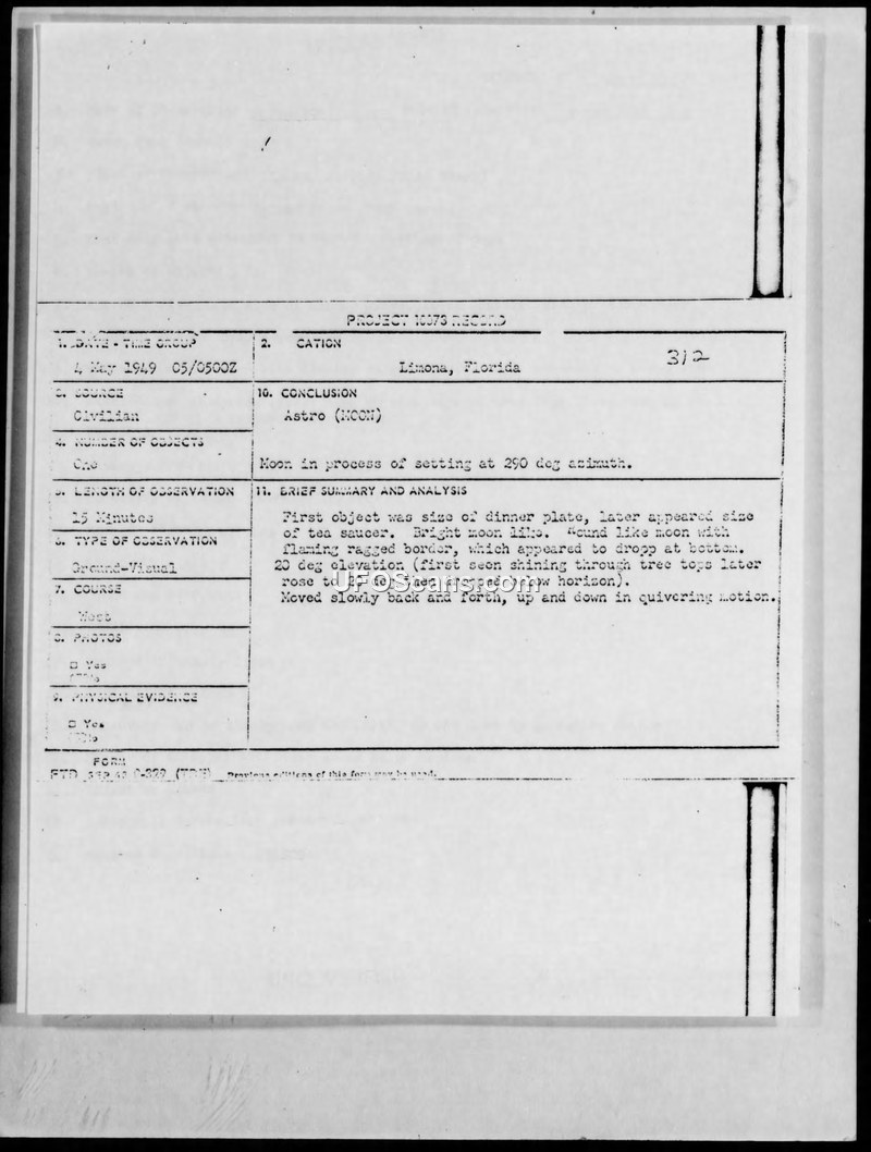 Incident #312 Sighting Report — Limona, Florida, 4 May 1949