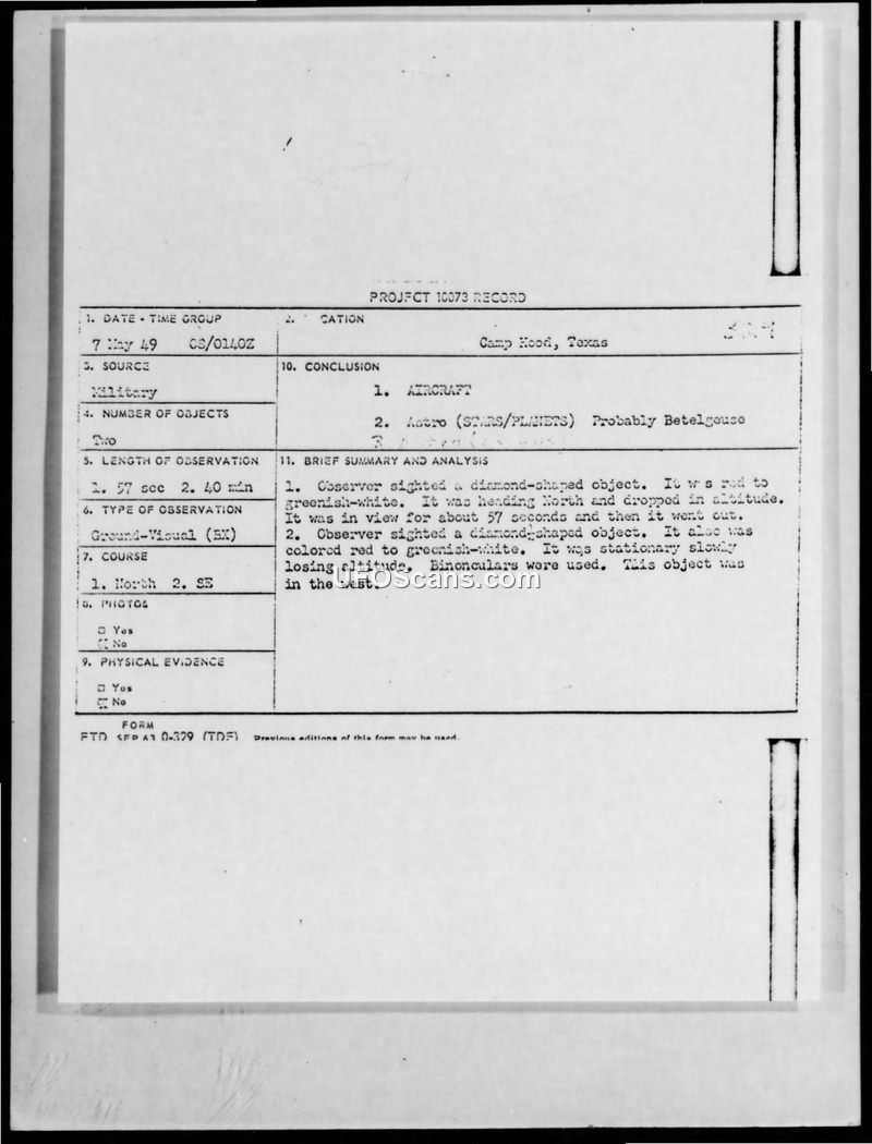 A series of unexplained aerial phenomena were observed over Camp Hood, Texas, between May and July 1949 by over 100 military personnel. Despite extensive investigation by the Fourth Army and OSI, no correlation with military or civilian activity was found, and the phenomena remained unidentified.