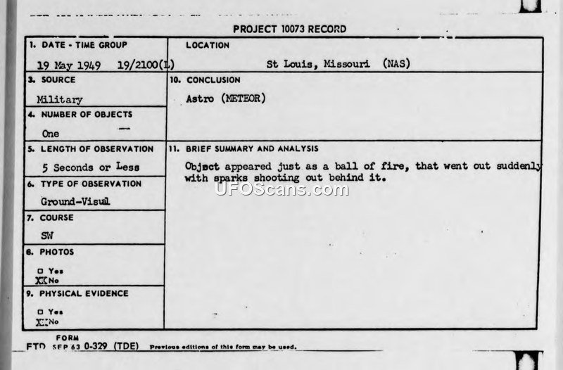 On 19 May 1949, multiple military witnesses in St. Louis observed a ball of fire with a trailing spark effect moving east to west. The incident was officially classified as a meteor by the Air Materiel Command.