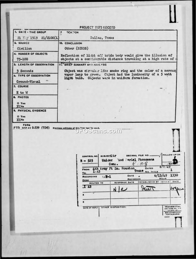 Multiple witnesses in Dallas reported seeing formations of luminous objects on 21 May 1949. The official military investigation concluded the objects were birds reflecting light.