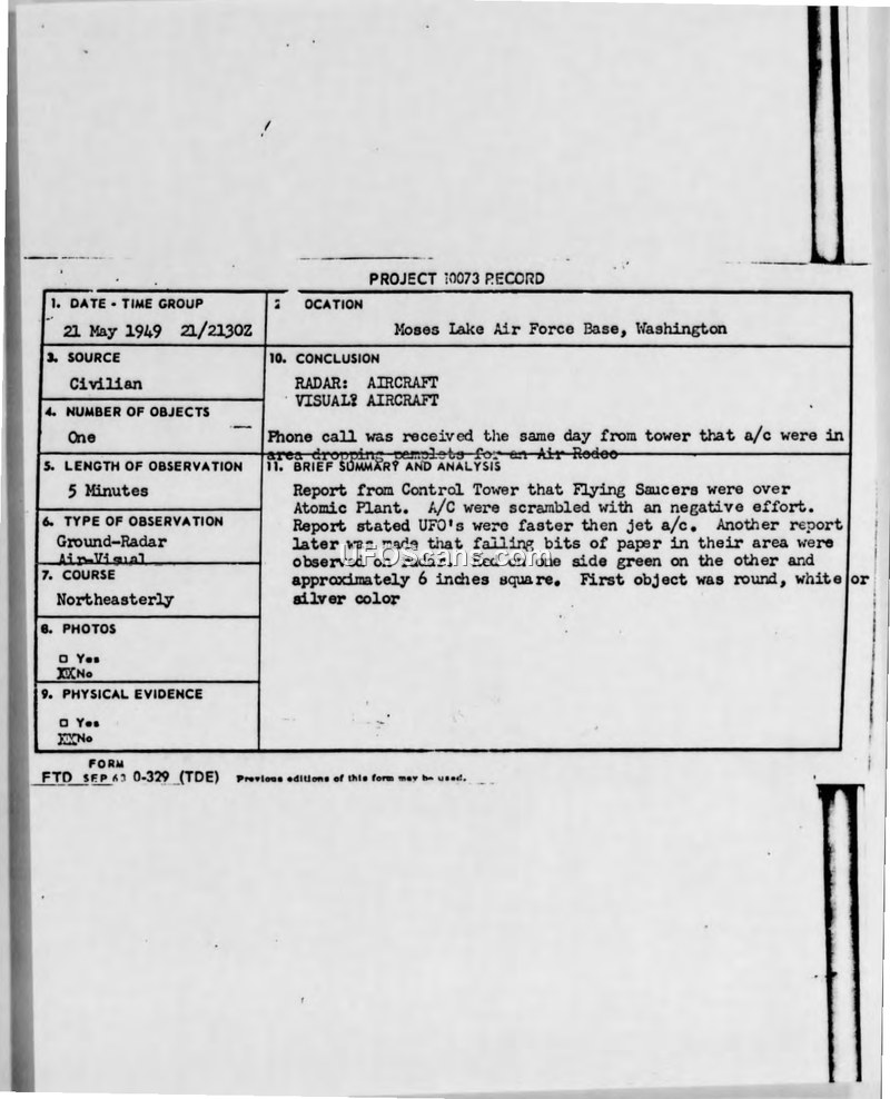 Project SIGN Report — Moses Lake Air Force Base, 21 May 1949