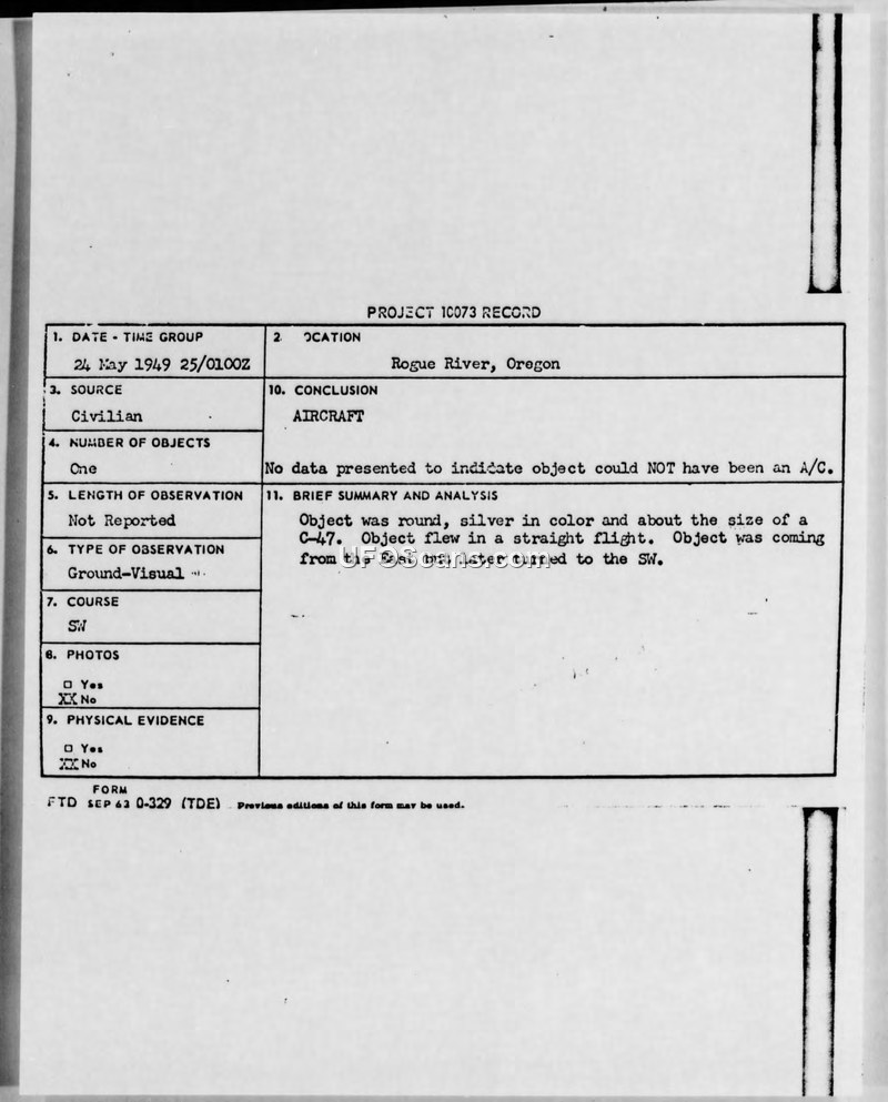 A civilian witness reported a round, silver, C-47-sized object over the Rogue River, Oregon, on May 24, 1949. Military investigation confirmed the area lacked radar coverage and concluded there was insufficient data to rule out a conventional aircraft.