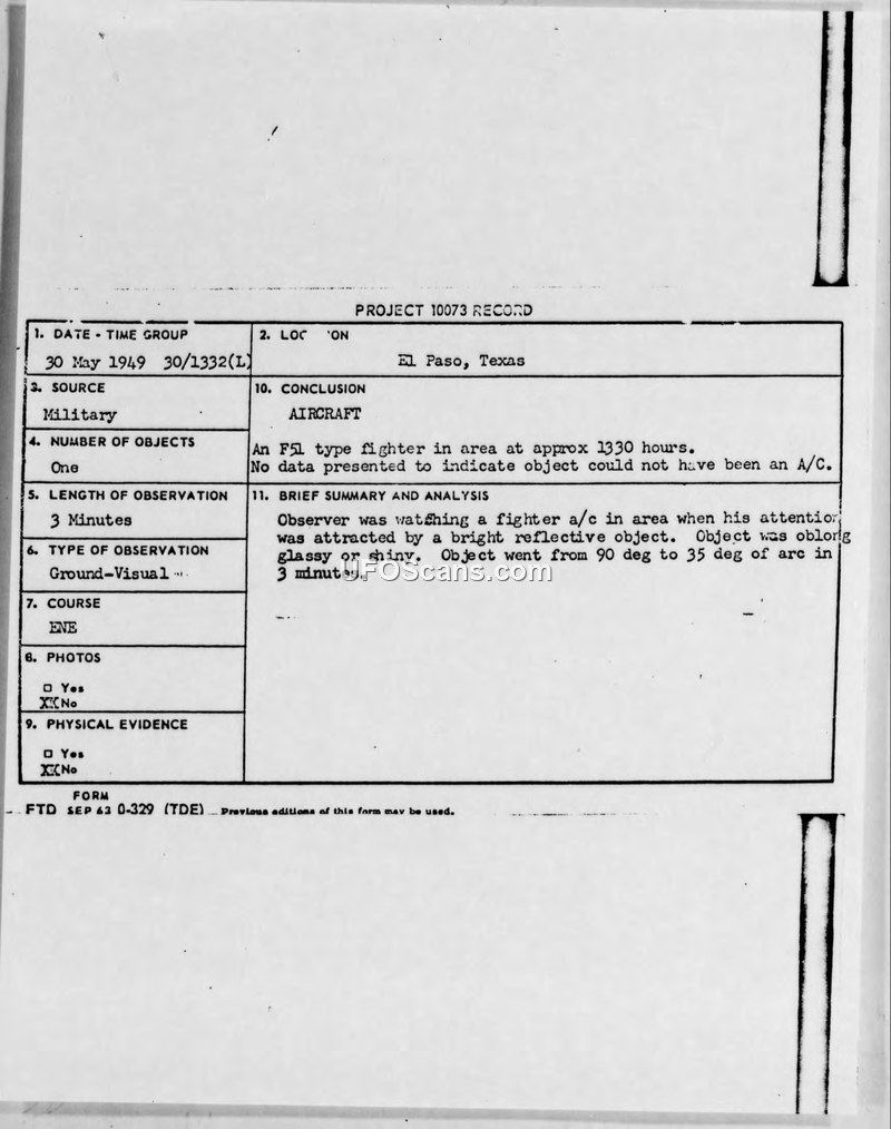 Military personnel at Fort Bliss reported an oblong, reflective object in the sky on May 30, 1949. The official military conclusion identified the object as an aircraft, noting the presence of an F51 fighter and weather balloons in the area at the time.