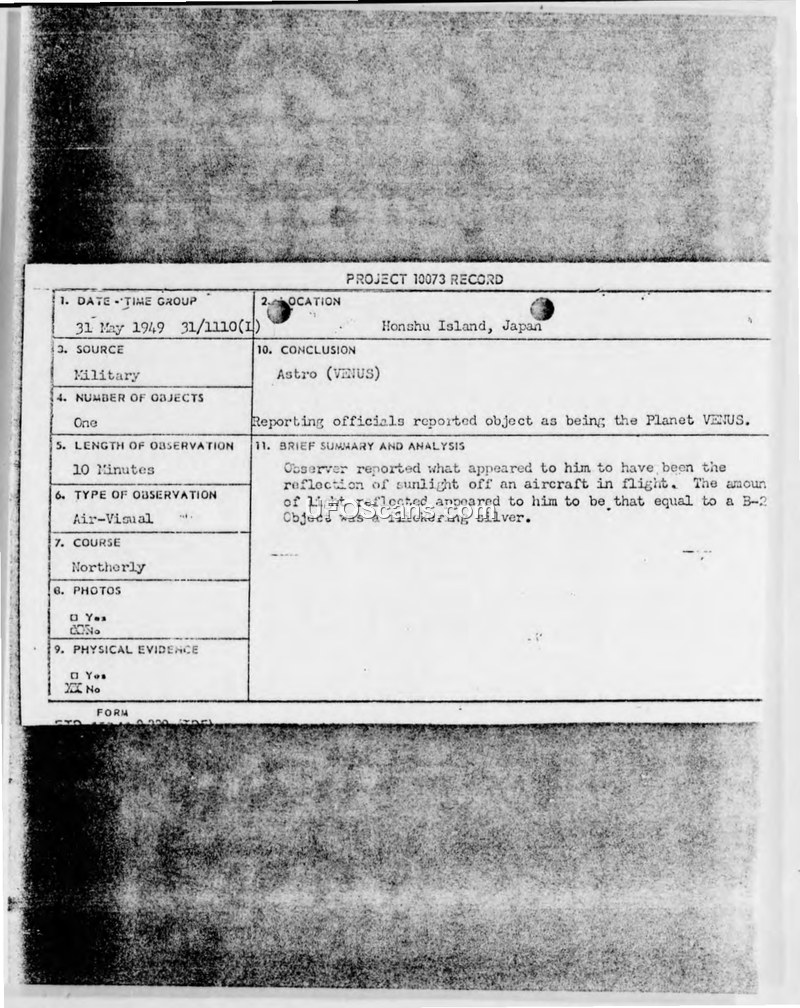 A US Air Force pilot reported a silver, circular object moving at high speed over Misawa Air Force Base on 31 May 1949. Intelligence officers concluded the object was likely the planet Venus or a foreign reconnaissance aircraft.