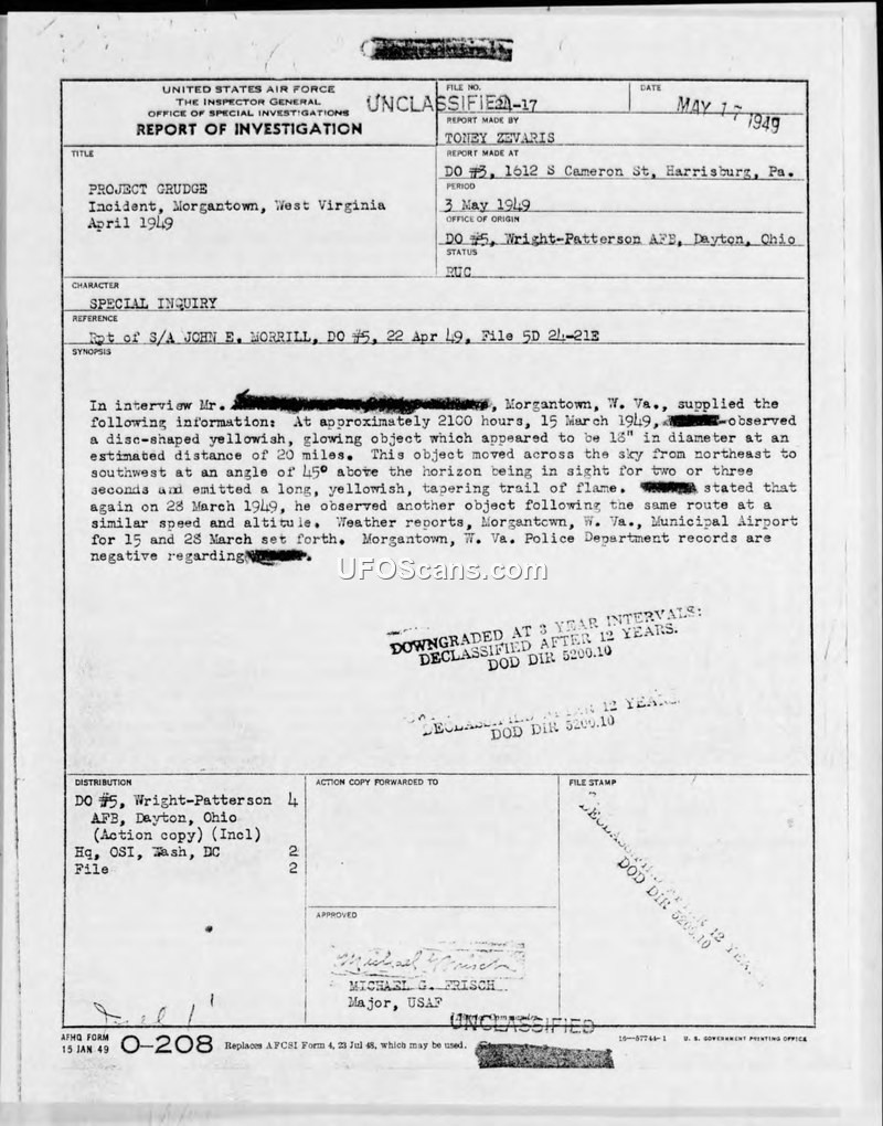 This report, dated 17 May 1949, details an investigation conducted by the Office of Special Investigations (OSI) regarding a series of unidentified aerial phenomena reported in Morgantown, West Virginia. The primary witness, a local resident involved in the real estate business, reported two separate sightings of glowing objects. The first occurred on 15 March 1949 at approximately 2100 hours, where the witness observed a disc-shaped, yellowish object with a long, tapering trail of flame. The object was estimated to be 13 inches in diameter at a distance of 20 miles, moving from the northeast to the southwest at a 45-degree angle above the horizon. The witness reported the object was in sight for two to three seconds. A second sighting occurred on 28 March 1949, involving an object described as a flattened funnel with a reddish-gold tint. The witness estimated this object to be 5 feet across and noted it left a persistent dark red tapering trail. The witness claimed the object maintained straight and level flight before disappearing into the distance. The investigation included a review of weather sequences provided by a CAA Aircraft Communicator at the Morgantown Municipal Airport, which indicated clear conditions on both dates. Additionally, the Morgantown Police Department records were checked and found to be negative regarding any reports of flights or incidents at the time. The report includes a sketch of the objects made by the witness. The investigation was conducted under Project Grudge, and the final report, signed by Special Agent Toney Zevaris and approved by Major Michael G. Frisch, concludes that the files for this specific incident are to be closed.