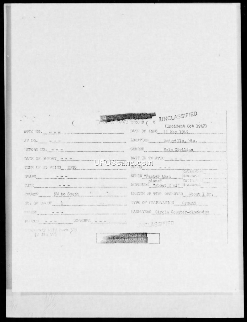 This document is a standardized sighting report form (Temporary ATIC Form 329) documenting an unidentified aerial phenomenon observed in October 1947 near Dodgeville, Wisconsin. The report, processed by the Air Technical Intelligence Center (ATIC) on May 11, 1949, relies on the testimony of a single male civilian witness. According to the report, the object was observed for approximately one hour at 2300 hours. The witness described the object's flight path as moving from the Northwest to the South at an estimated altitude of about two miles. The object was reported to be moving at a speed described as 'faster than plane' and exhibited a counter-clockwise circular maneuvering pattern. The form indicates that no photographs or sketches were provided in relation to the incident. The document is marked as unclassified and was finalized on January 2, 1952.