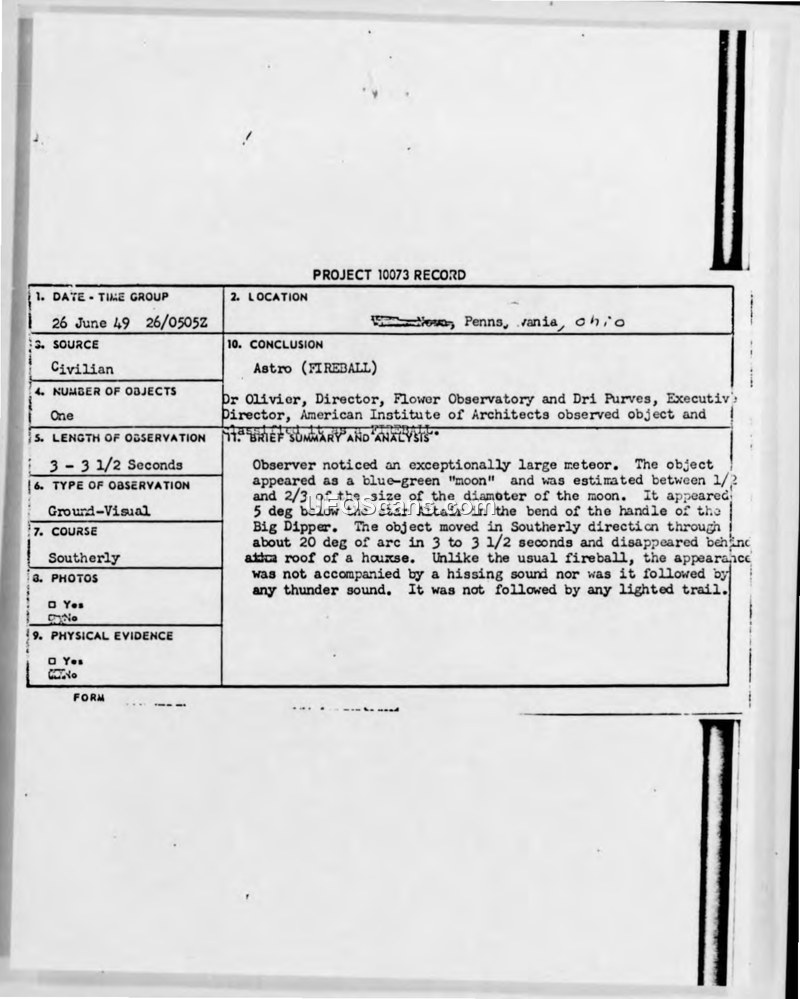A 1949 OSI investigation into a 26 June sighting of a blue-green object in Media, Pennsylvania. Experts, including Dr. Charles P. Olivier, concluded the object was an exceptionally large meteor or fireball.