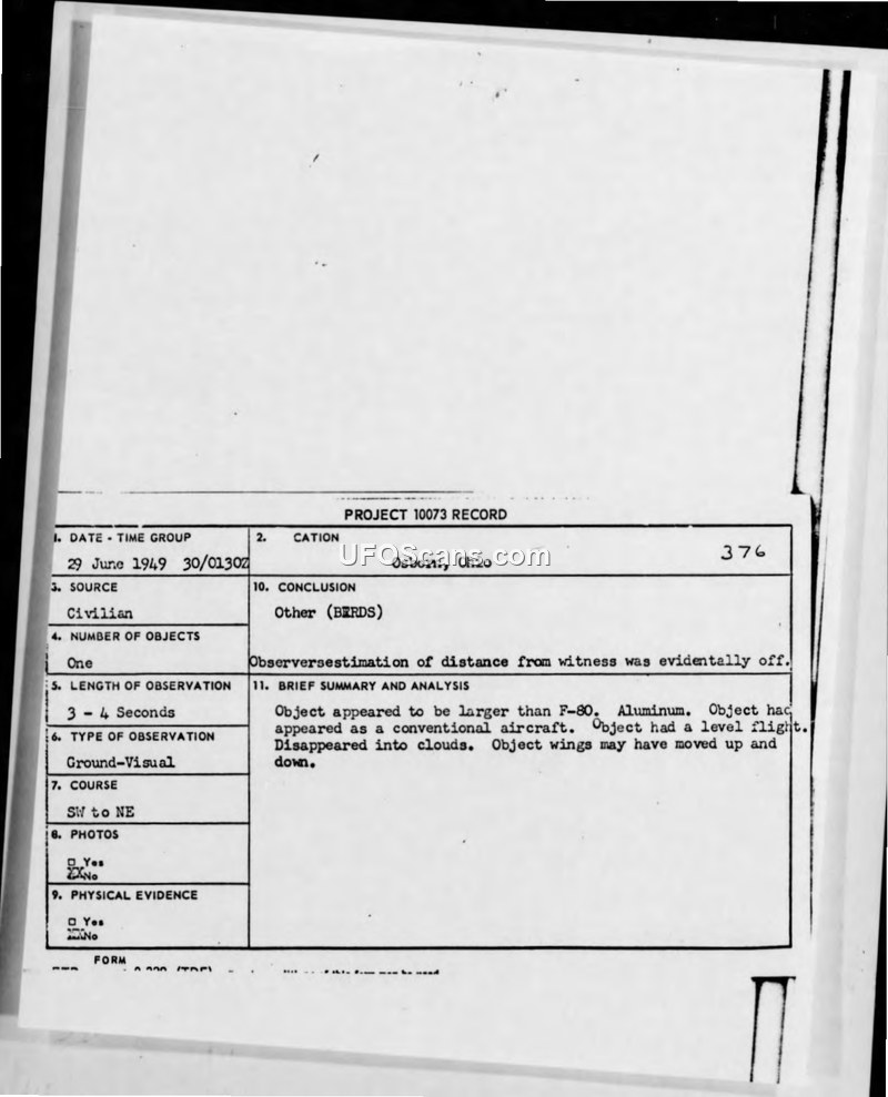 This document details the investigation of a UFO sighting (Incident No. 376) that occurred on June 29, 1949, near Osborn, Ohio. The witness, identified as a USAF radio engineer, reported observing a single, aluminum-colored object that appeared larger than an F-80 aircraft. The object was described as having a level flight path, moving from southwest to northeast, and remaining in sight for approximately 3 to 4 seconds. The witness noted that the object made no sound and that its wings may have moved up and down. The observation took place between 2030 and 2100 hours. Following the report, the Flight Test Division conducted an investigation to determine if any military or experimental aircraft were in the area. Records indicated that the only jet aircraft in the air at the approximate time was an F-80 (serial #45-8479) returning from Chicago, which had landed by 1846 hours. Consequently, the military concluded there was no known flight test activity in the vicinity at the time of the sighting. The final official conclusion for the incident was categorized as 'Other (BIRDS),' with the assessment that the witness's estimation of the object's distance and size was significantly inaccurate. The document includes standard 'Guide to Investigation' forms used by the Air Materiel Command, which outline the criteria for reporting such sightings, including radar data, weather conditions, and physical evidence, though most of these fields were not applicable or were marked as negative in this specific case.