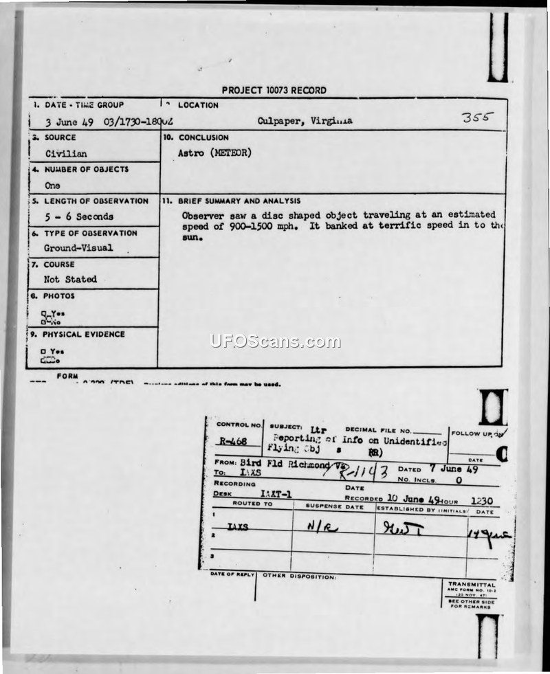 Project 10073 Record: Incident 355 - Culpeper, Virginia, 3 June 1949