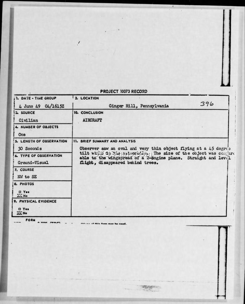 Project 10073 Record: Incident #396 - Ginger Hill, Pennsylvania