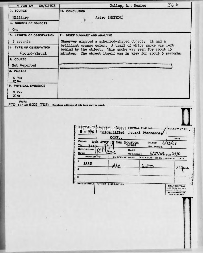 Incident #366 Sighting Report — Wingate Ordnance Depot, Gallup, New Mexico, 5 June 1949
