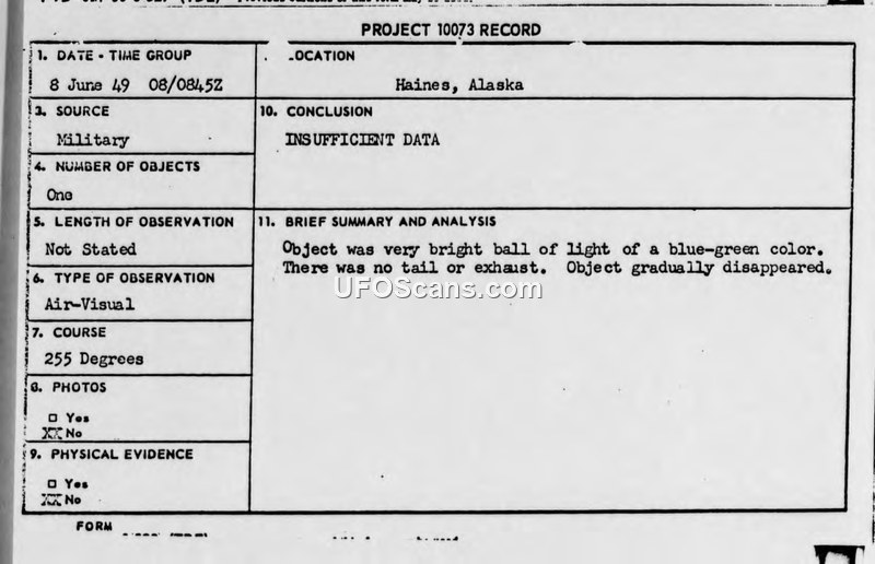 This document is a Project 10073 record detailing an unconventional aircraft sighting that occurred on June 8, 1949, near Haines, Alaska. The report, originating from the Alaskan Air Command, describes an encounter involving a C-46 aircraft piloted by personnel from Col. Worth Airlines. While flying at an altitude of 12,000 feet on a magnetic course of 165 degrees, the pilots observed a bright blue-green ball of light directly in front of their aircraft. The object, which lacked any visible tail or exhaust, forced the pilots to swerve to avoid a potential collision. The observers estimated the object's speed to be approximately 800 mph. The object was observed through 45 degrees of the horizon before it gradually disappeared. The report notes that the observers were experienced pilots, one of whom was a former Air Force officer, and that they appeared to be of normal intelligence. The investigating officer highlighted a similarity between this incident and a sighting previously reported in AIC Intelligence Report IR-18-49, as both involved a blue-green ball of light traveling at a high rate of speed. Despite the detailed account provided by the aircrew, the official conclusion reached by the Chief of Intelligence for the 501st Wing at Ladd Air Force Base was that there was insufficient data to identify the object.