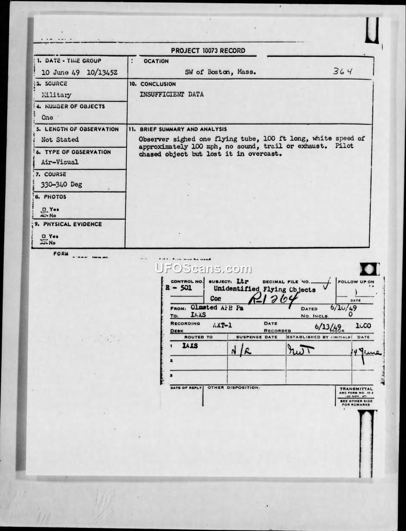 On June 10, 1949, a military pilot in an AT-6 aircraft observed a 100-foot white, tubular object at 30,000 feet near Boston. The pilot attempted to intercept the object but lost it in cloud cover, leading to an official conclusion of 'insufficient data'.