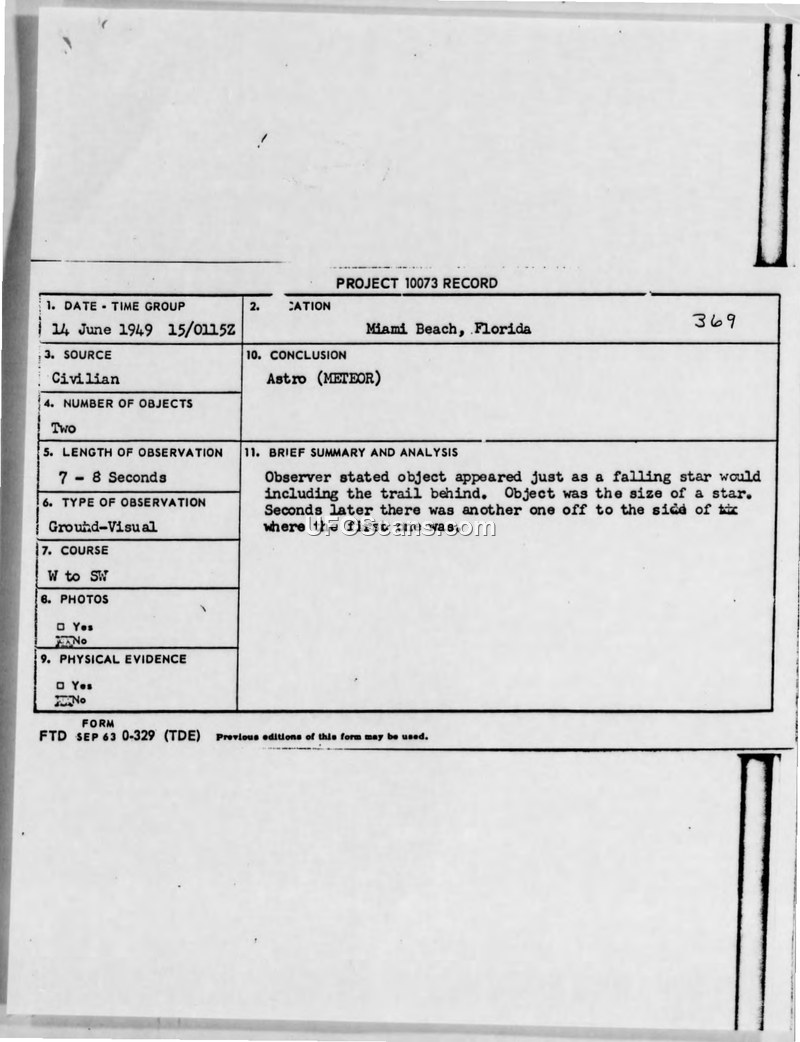The sighting in Miami Beach was concluded to be of natural celestial origin (meteor). The La Jolla sighting remains an incident report without a final stated conclusion in the provided text.