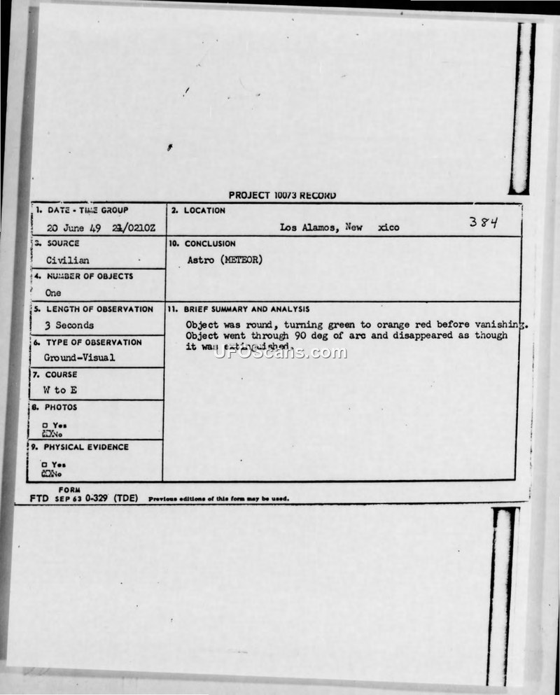 A security inspector at Los Alamos reported a 3-second sighting of a green-to-orange-red luminous object on June 20, 1949. The official conclusion for this incident, recorded under Project 10073, was that the object was a meteor.