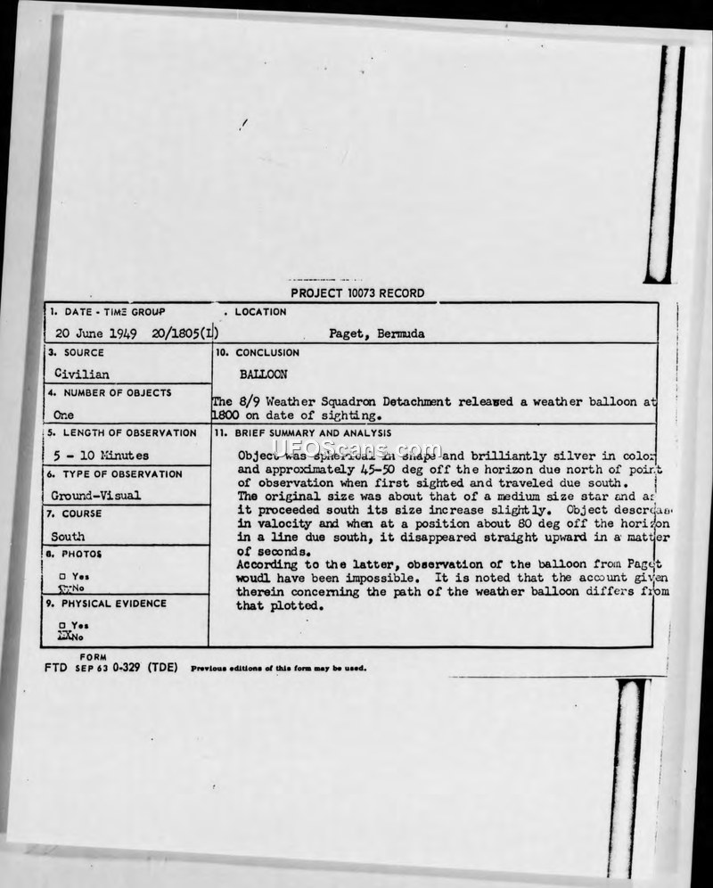 An unidentified spherical object was sighted over Bermuda on 20 June 1949. While officially classified as a balloon, investigators noted that the balloon's plotted trajectory made the reported observation from the witness's location impossible.