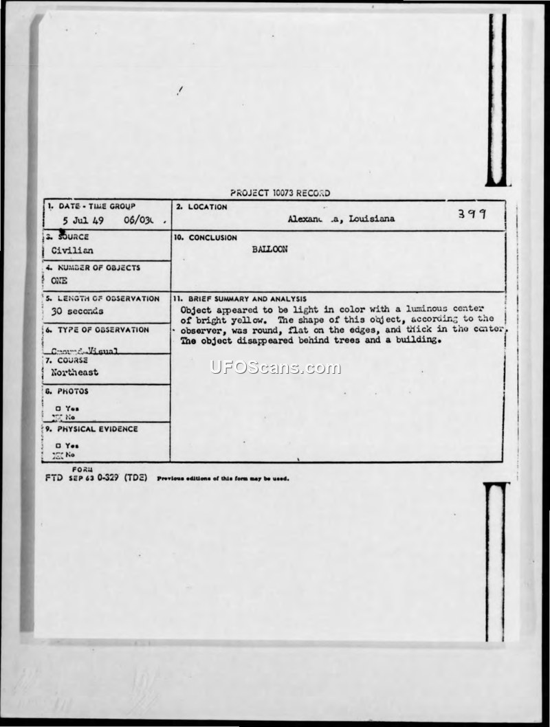 The object was observed by a witness in Alexandria, Louisiana, on July 5, 1949. The witness described a round, luminous object that moved horizontally before disappearing behind trees and a building. The investigation concluded the object was a balloon.