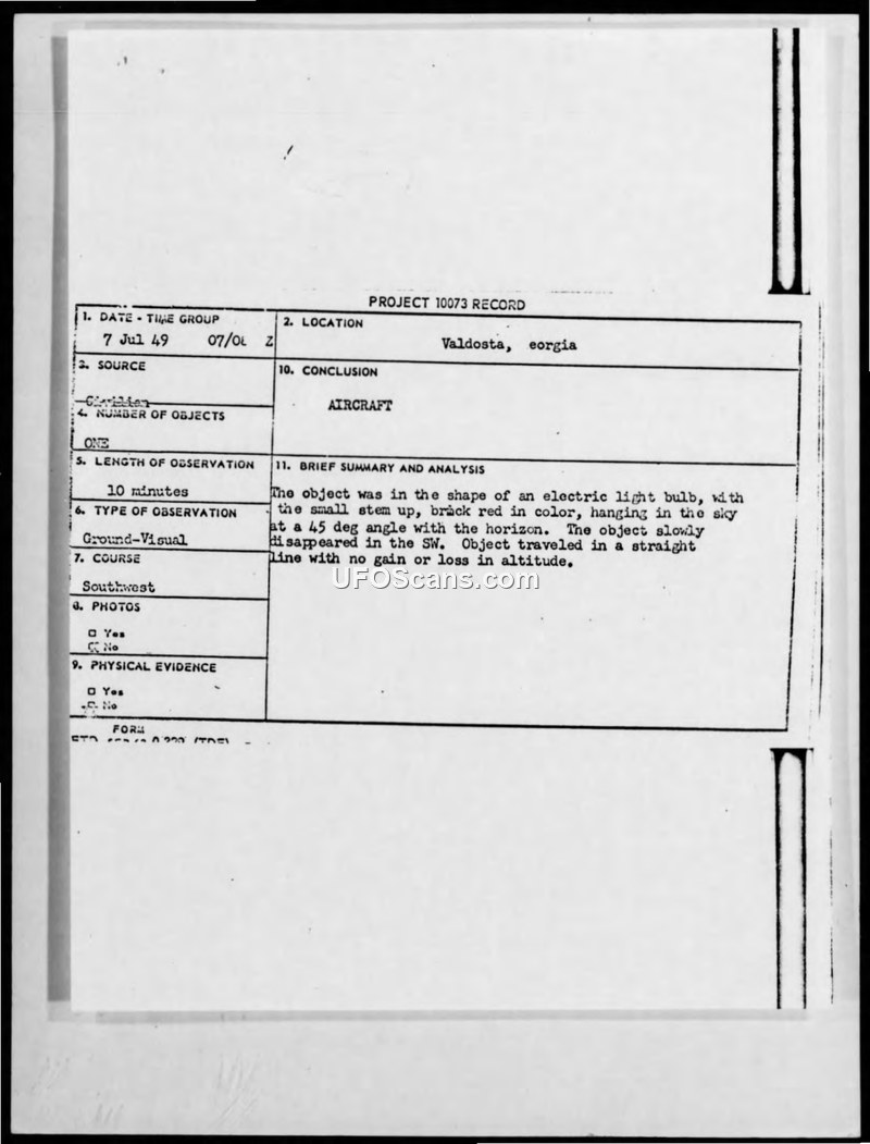 Project 10073 Record: Sighting of Flying Discs on 7 July 1949, Valdosta, Georgia