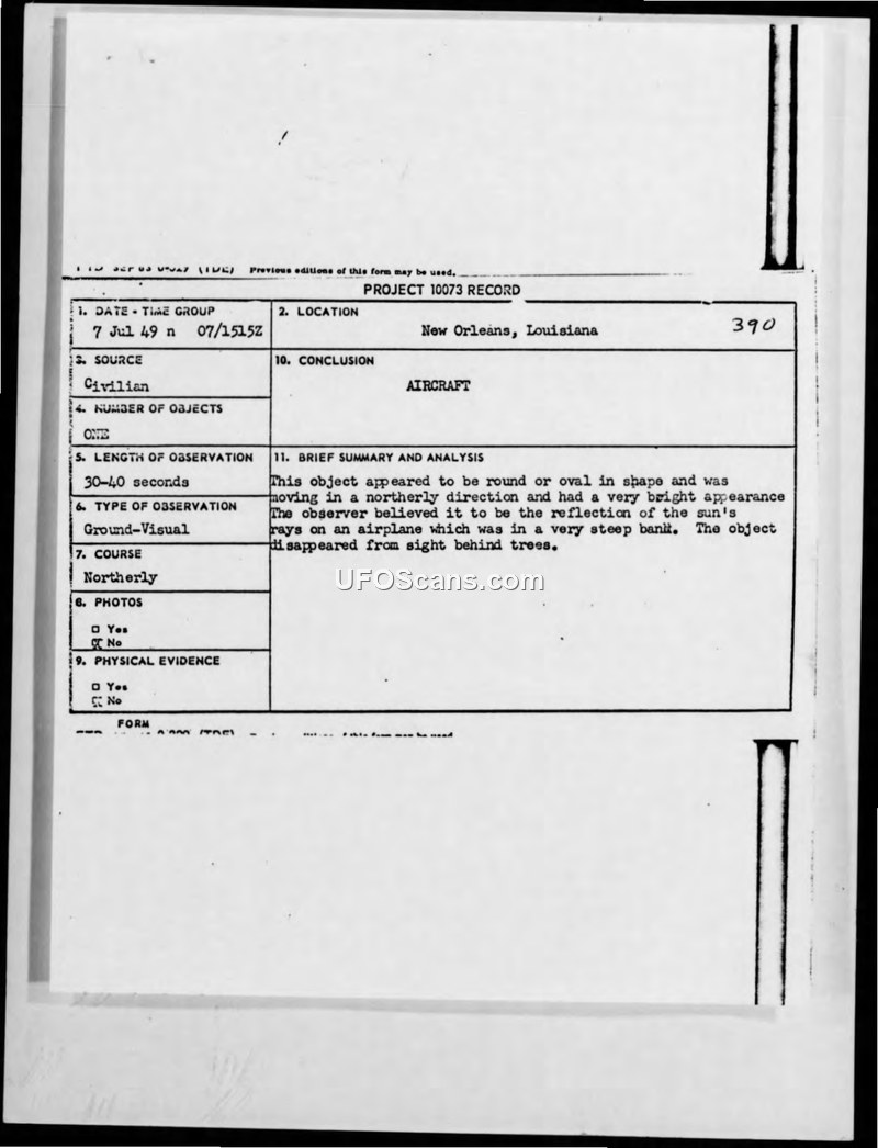 Incident #390 Sighting Report — New Orleans, Louisiana, 7 July 1949