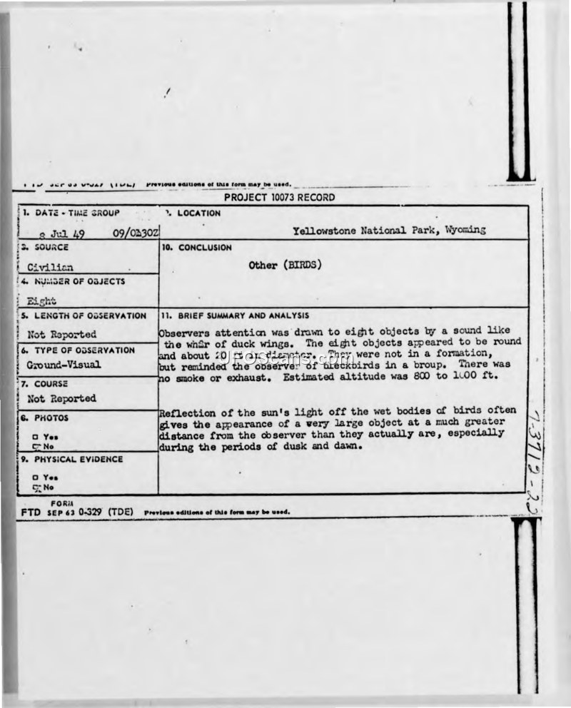 Project 10073 Record: Sighting at Yellowstone National Park, July 8, 1949