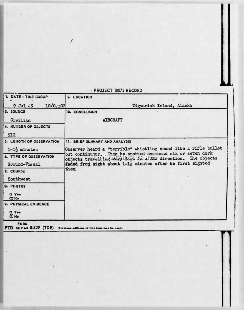 A civilian witness reported seeing six or seven dark, fast-moving objects near Tigvariak Island, Alaska, in July 1949. The Air Force investigation concluded the sighting was likely the planet Venus.