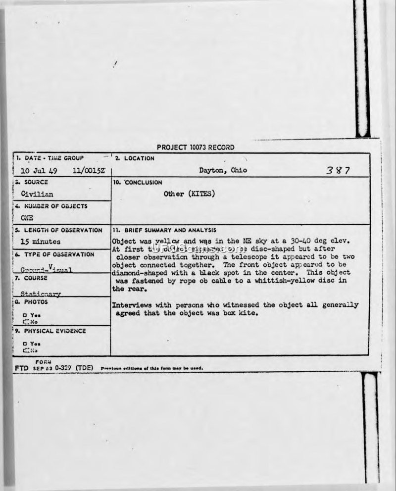 Project 10073 Record: Incident 387 - Dayton, Ohio, 10 July 1949