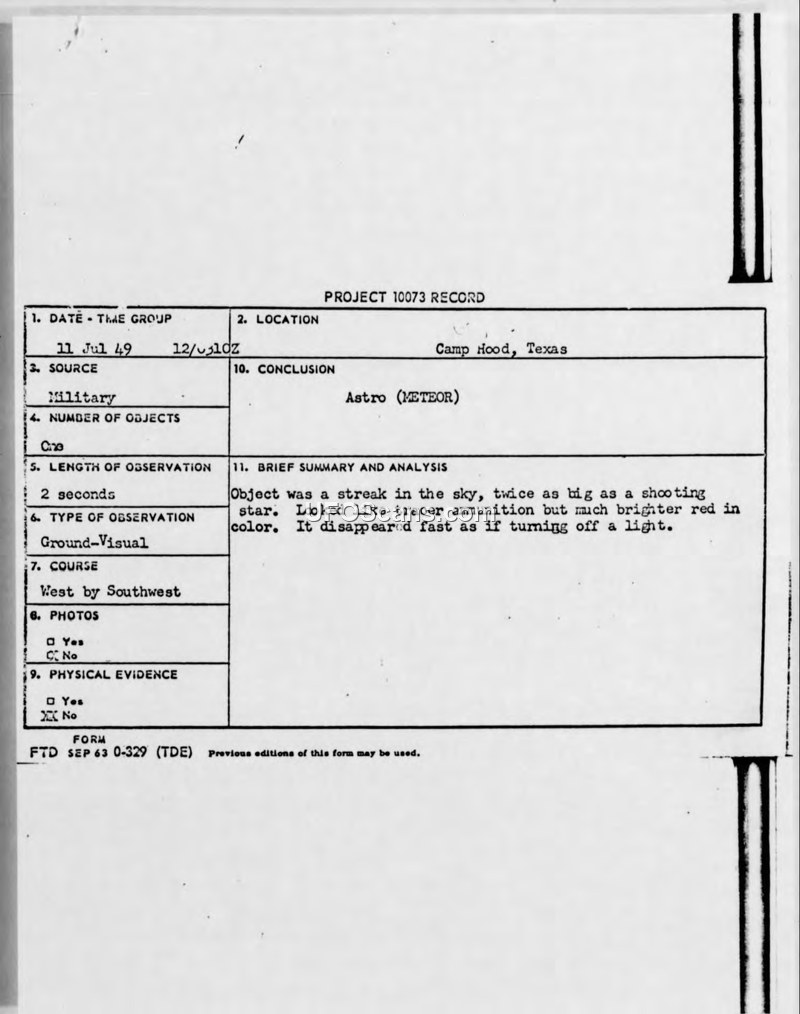 A 1949 military report from Camp Hood, Texas, documents a Sergeant's sighting of a red, ball-shaped object moving across the sky. The incident was officially classified as a meteor.