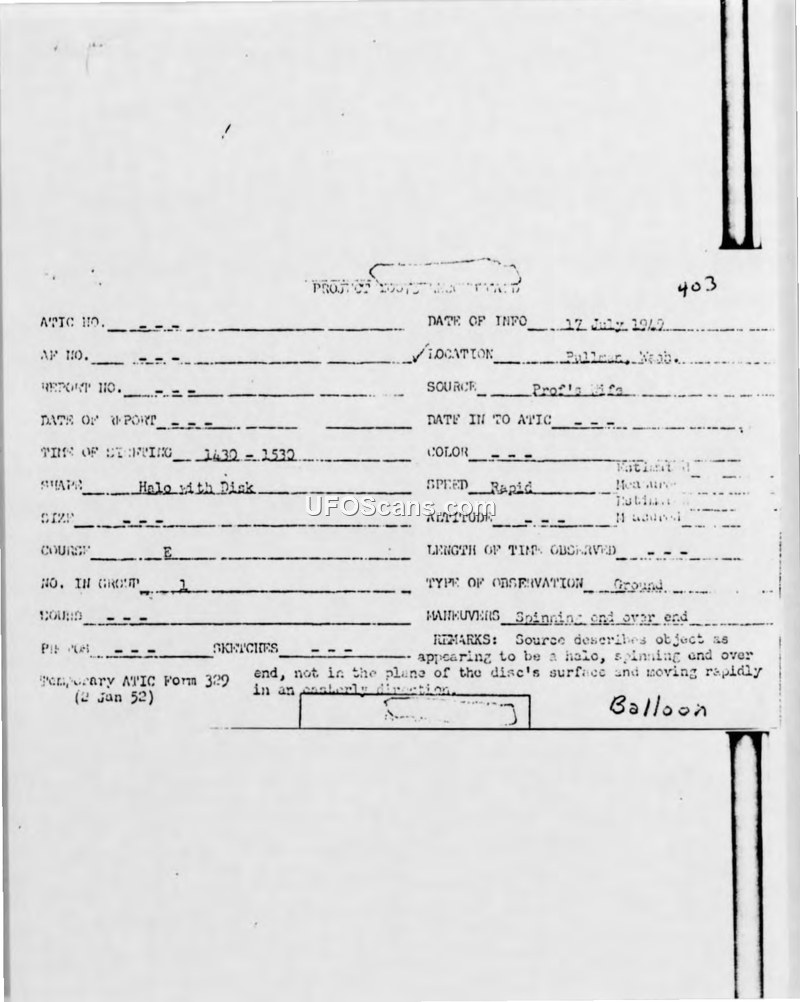 Incident No. 403 Sighting Report — Pullman, Washington, 17 July 1949