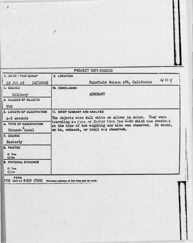Incident #404 Sighting Report — Fairfield-Suisun AFB, California, 18 July 1949