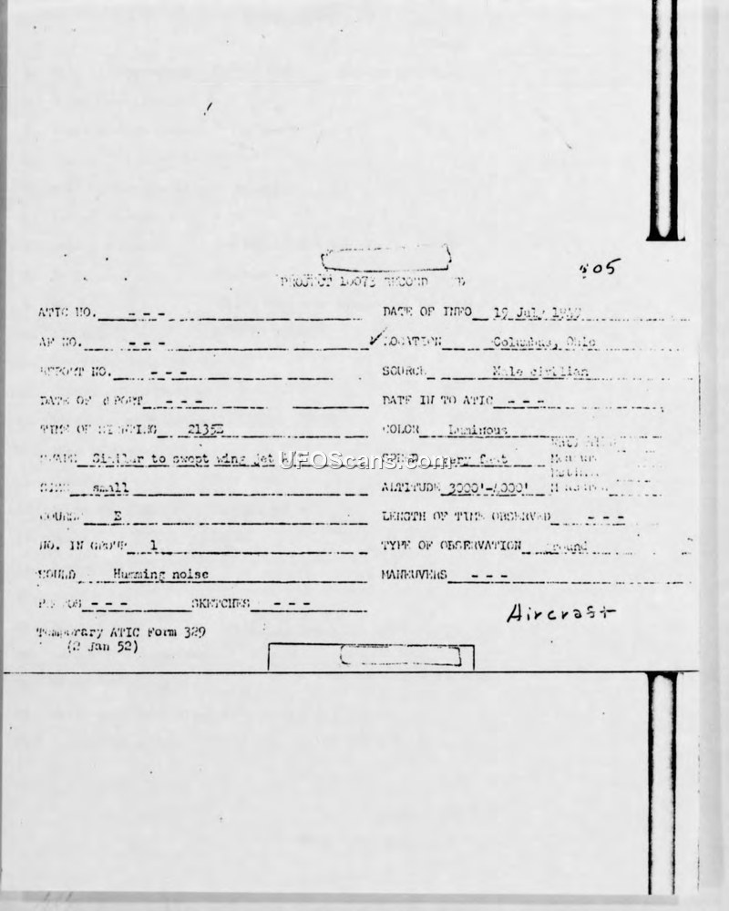 A report of a luminous, flying-wing shaped object observed over Columbus, Ohio, on July 19, 1949. The witness, a photographer with aviation experience, noted the object made a humming noise and lacked visible exhaust.