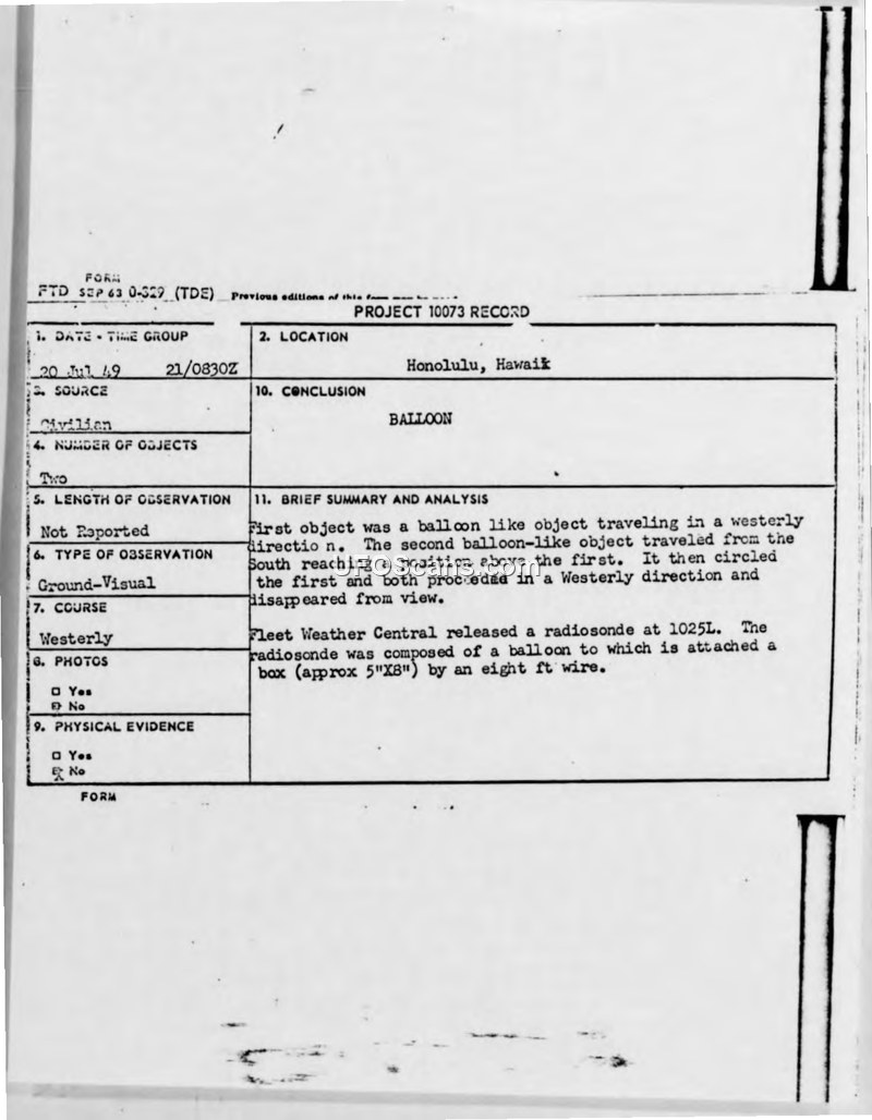Project 10073 Record: Sighting in Honolulu, Hawaii, 20 July 1949