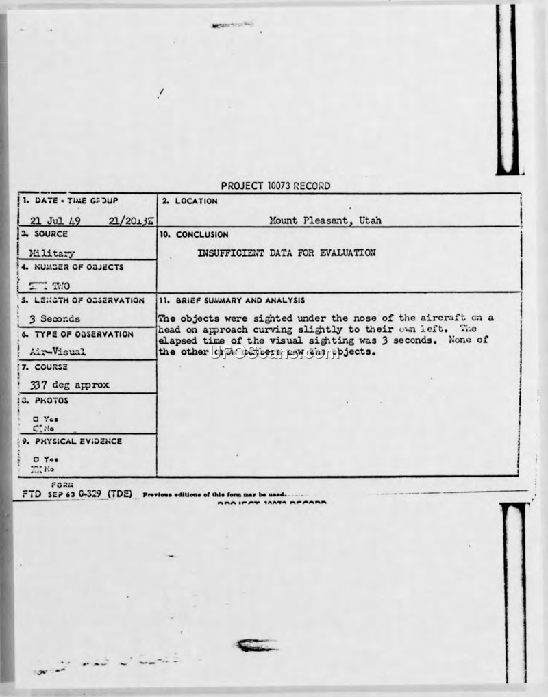 Project 10073 Record — Sighting at Mount Pleasant, Utah, 21 July 1949