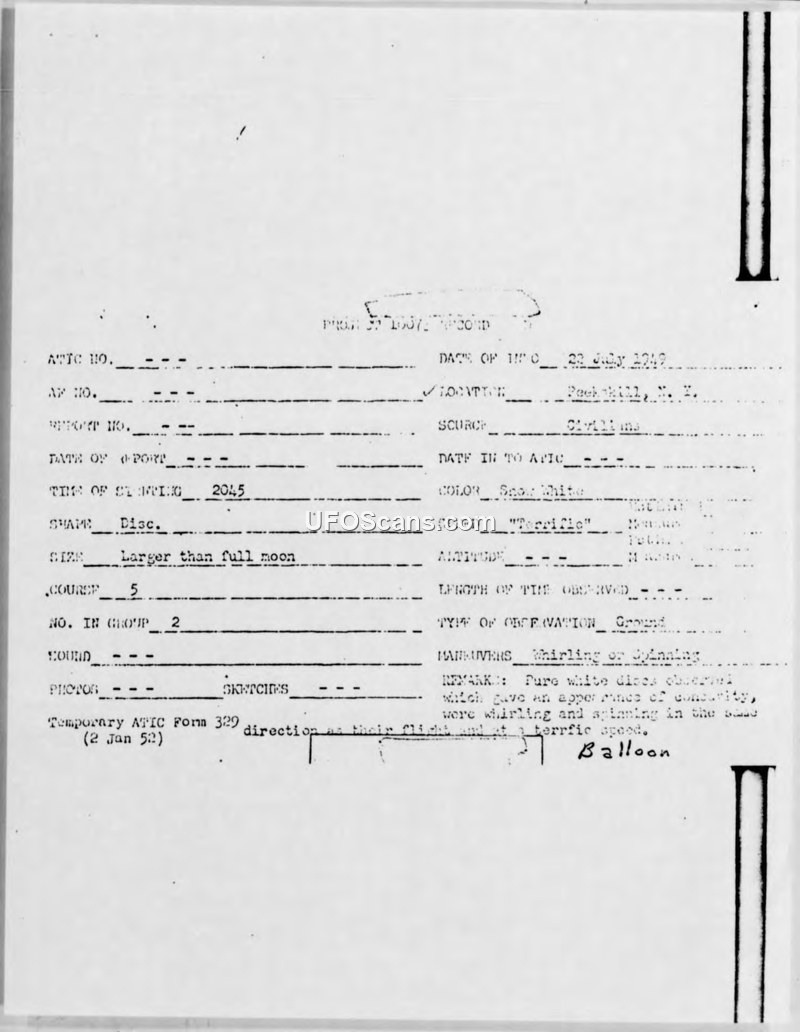 A Peekskill, NY resident reported a sighting of two white discs on July 22, 1949, which coincided with local radio station interference. The Air Force officially attributed the sighting to plastic research balloons and dismissed the radio interference as coincidental technical failure.