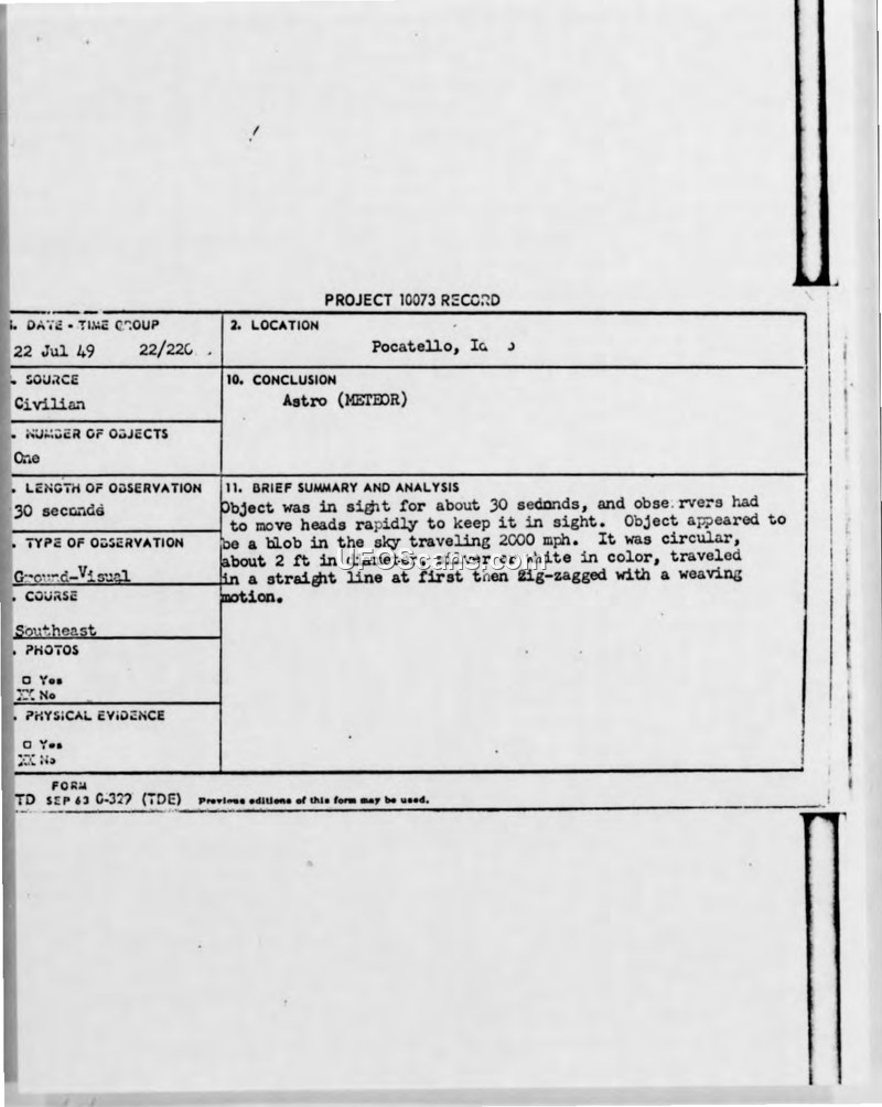 PROJECT 10073 RECORD - Pocatello, Idaho - 22 Jul 49